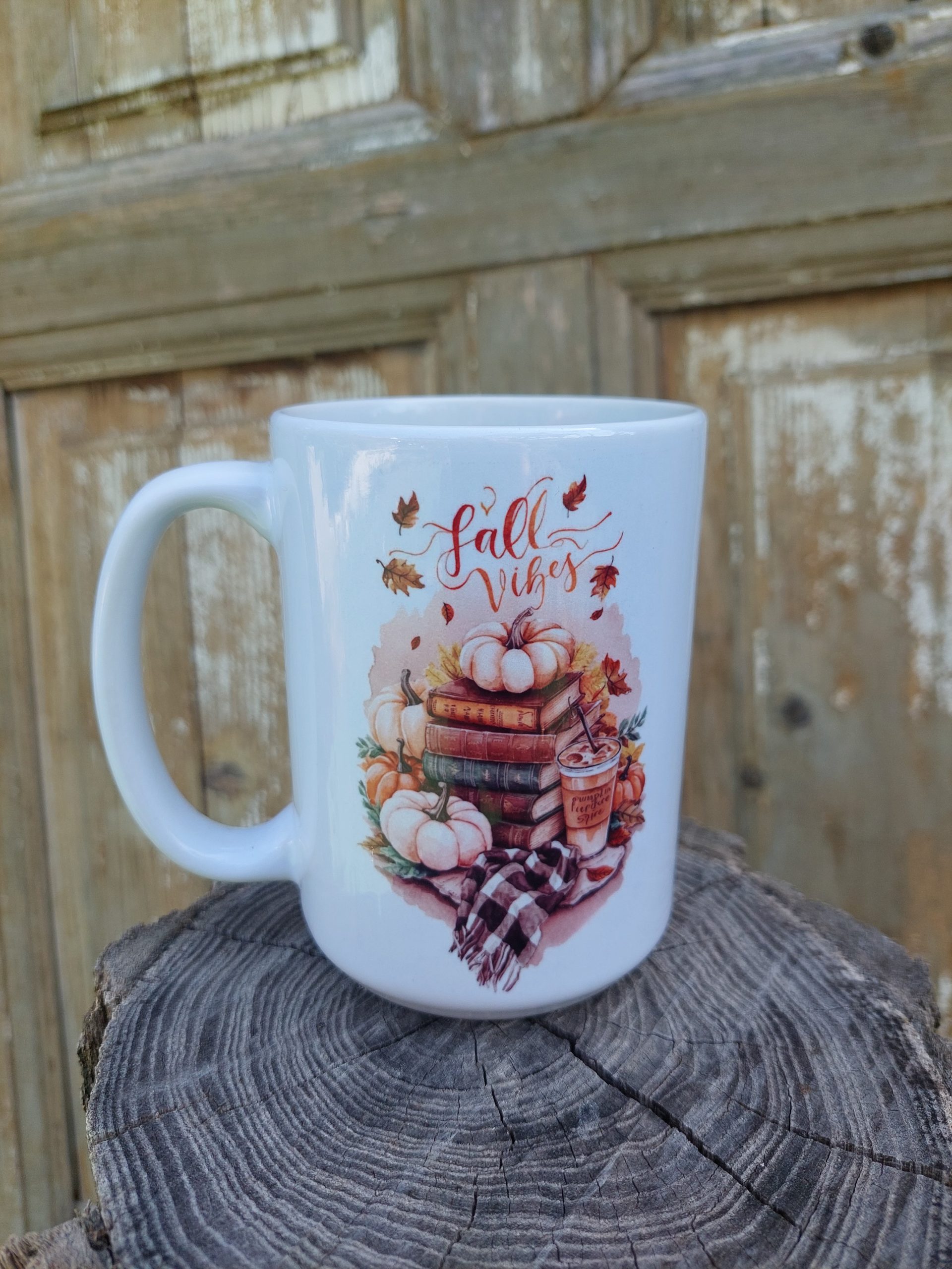 Vastag falú, 4.5 dl űrtartalmú, fényes felületű kerámia bögre, fall vibes felirattal, őszi mintával.